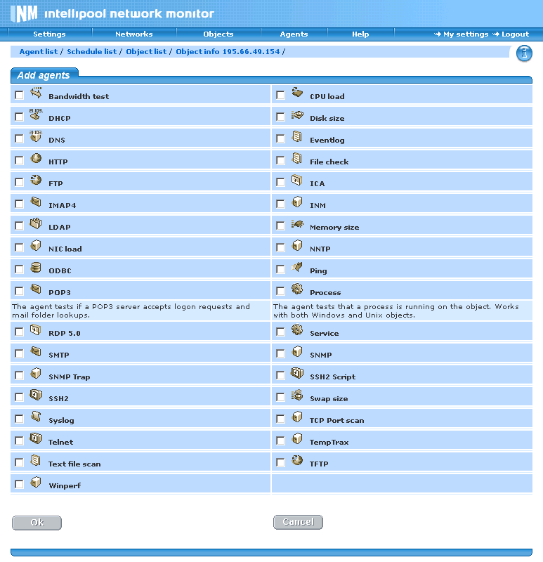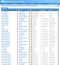 Esta lista mostra todos os agentes definidos. Todos os ítens nas colunas podem ser ordenados, tornando mais fácil a apresentação da lista de acordo com seu status ou tipo, por exemplo.