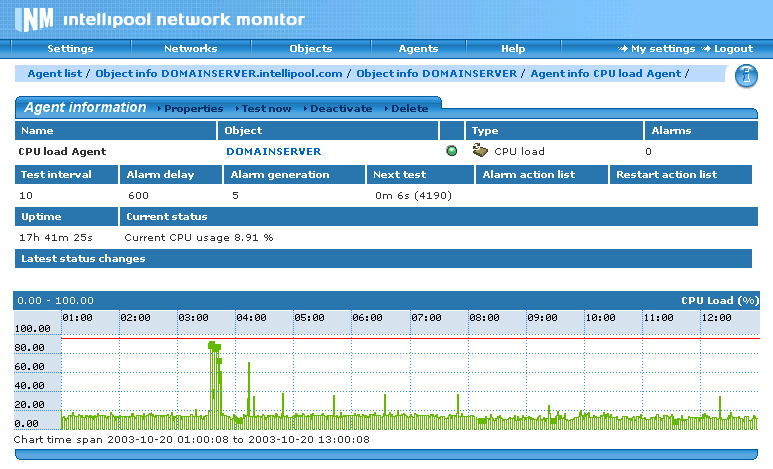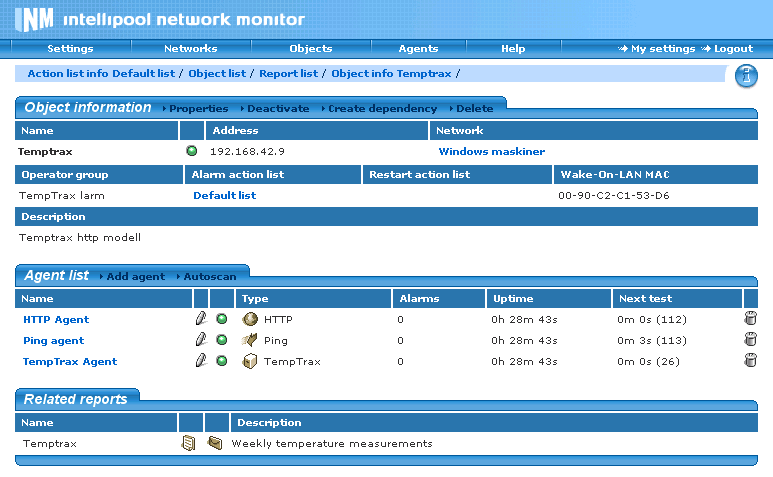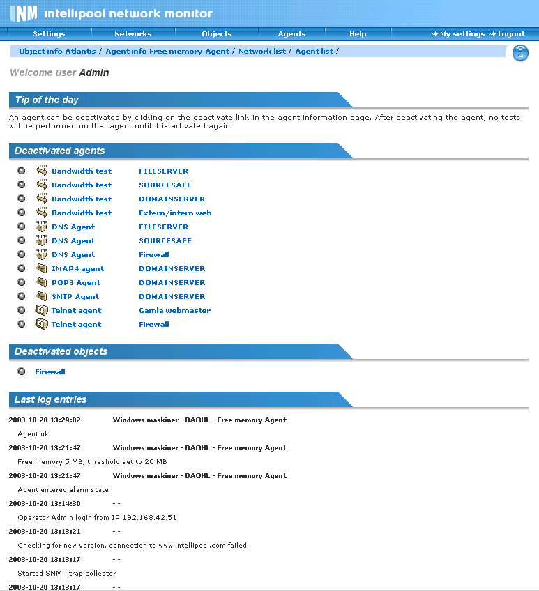 Esta página é o índice do INM. Várias informações são mostradas nela, por exemplo, agentes que estão desativados ou em estado de alarme.