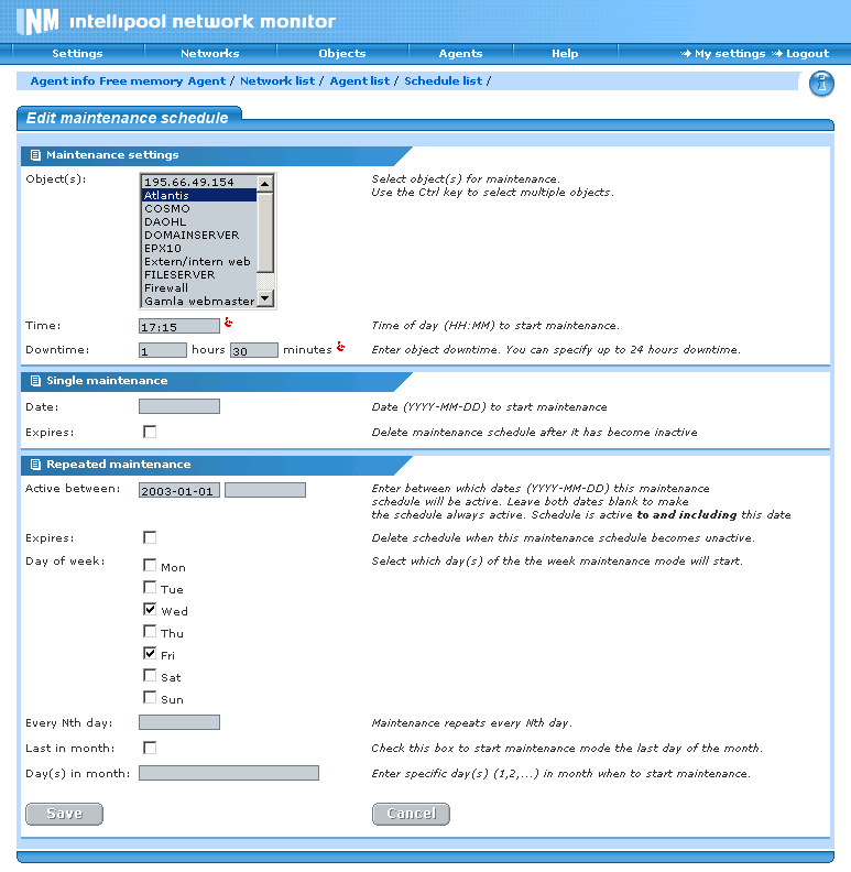 Esta tela mostra as propriedades da Agenda de Manutenção. Quando um objeto entra no modo de manutenção, nenhum teste será feito nos agentes daquele objeto.