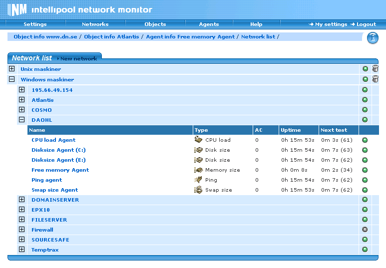 As redes são listadas no INM em uma estrutura de árvore. Para expandir os objetos e agentes, basta clicar nos ícones mais/menos.